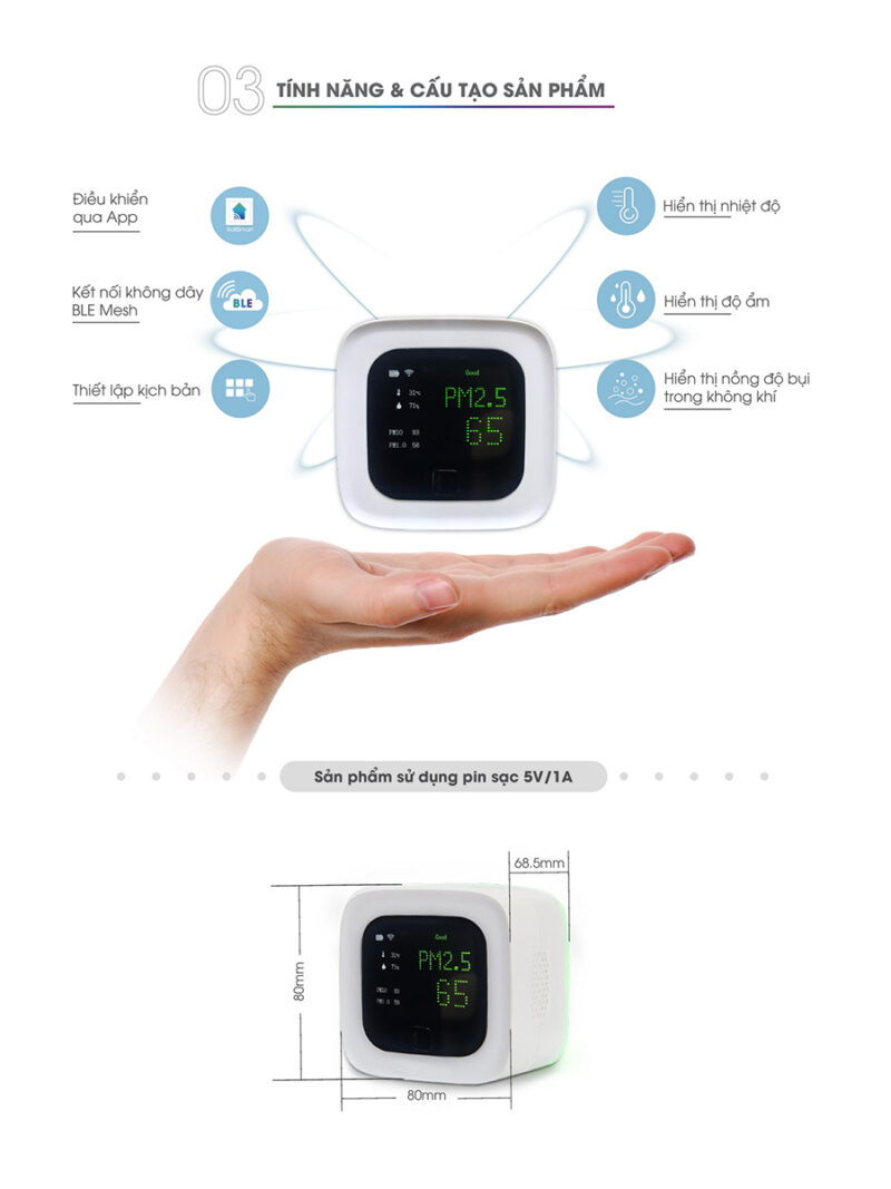 - Cảm biến bụi mịn CB05.PM2.5.BLE cung cấp giám sát chất lượng không khí với kết nối Bluetooth Mesh.