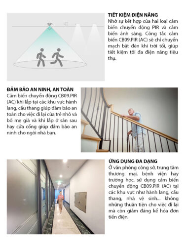 - Cảm biến chuyển động CB09.PIR (AC) sử dụng công nghệ PIR để phát hiện chuyển động hiệu quả.